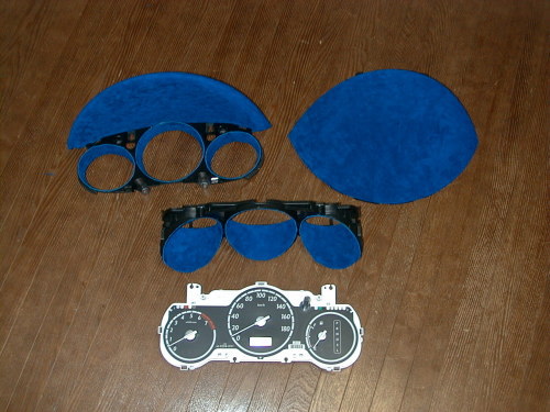 メーター周りに本革のスウェードを貼ってみました。 カラーはメーターイルミをブルーに変更しているので、それに合わせてディープ・ブルーに。 メーターフード、メーター内部の側壁などです。 メーターの一番手前に取り付けられているパネルは貼らない方がサマになると判断しました。