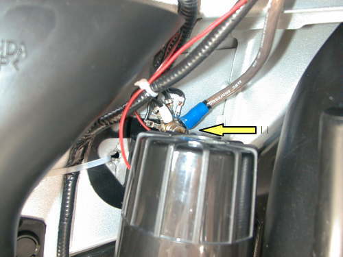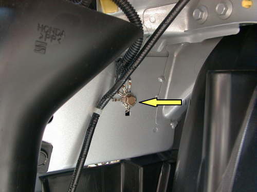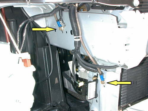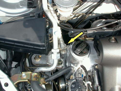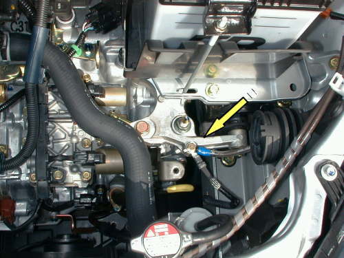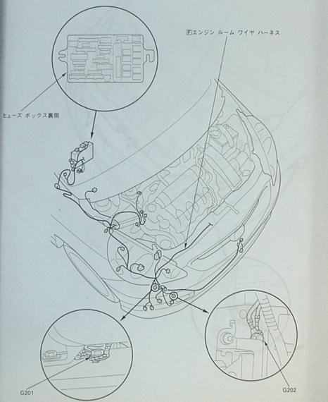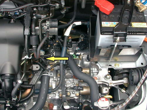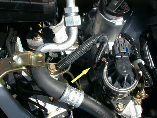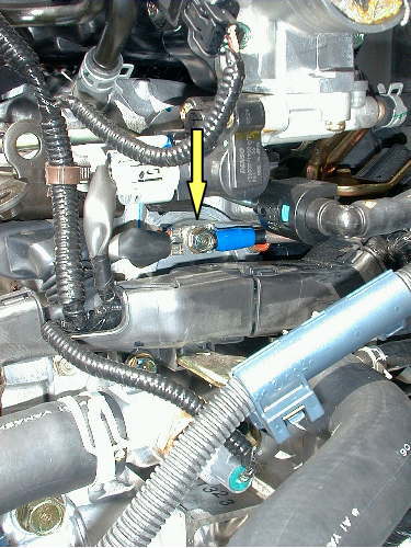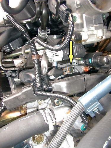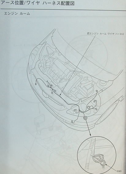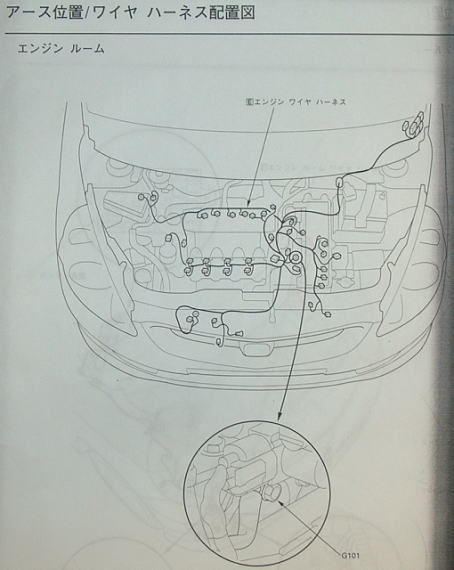 横から見た矢印の部分にエンジンワイヤハーネスのアースがあります。 |