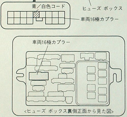 そのヒューズBOXの裏側にコネクターがたくさん接続されていますが、車両16極カプラーの青/白コードが車速パルスです。