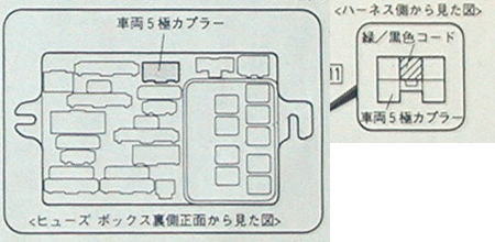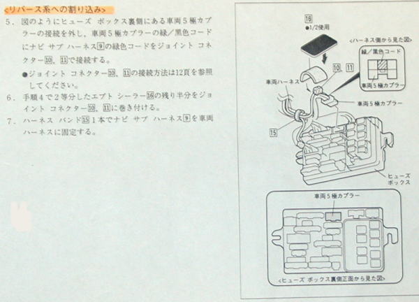 同様にヒューズBOX裏側の車両5極カプラーの緑/黒コードがバックランプ(リバース)信号です。