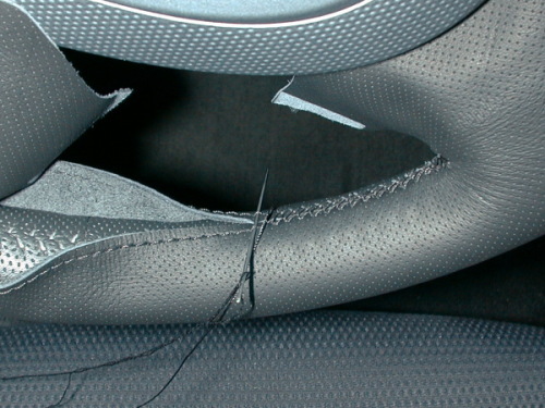 縫い付けを丁寧にやればやるほど時間はかかりますが、そのぶん皺もなく綺麗に仕上がります。 ステアリング・カバーといっても見た目はまんま革製のハンドルですね。 施工方法は本革巻ステアリングとほとんど一緒の方法だと思います。